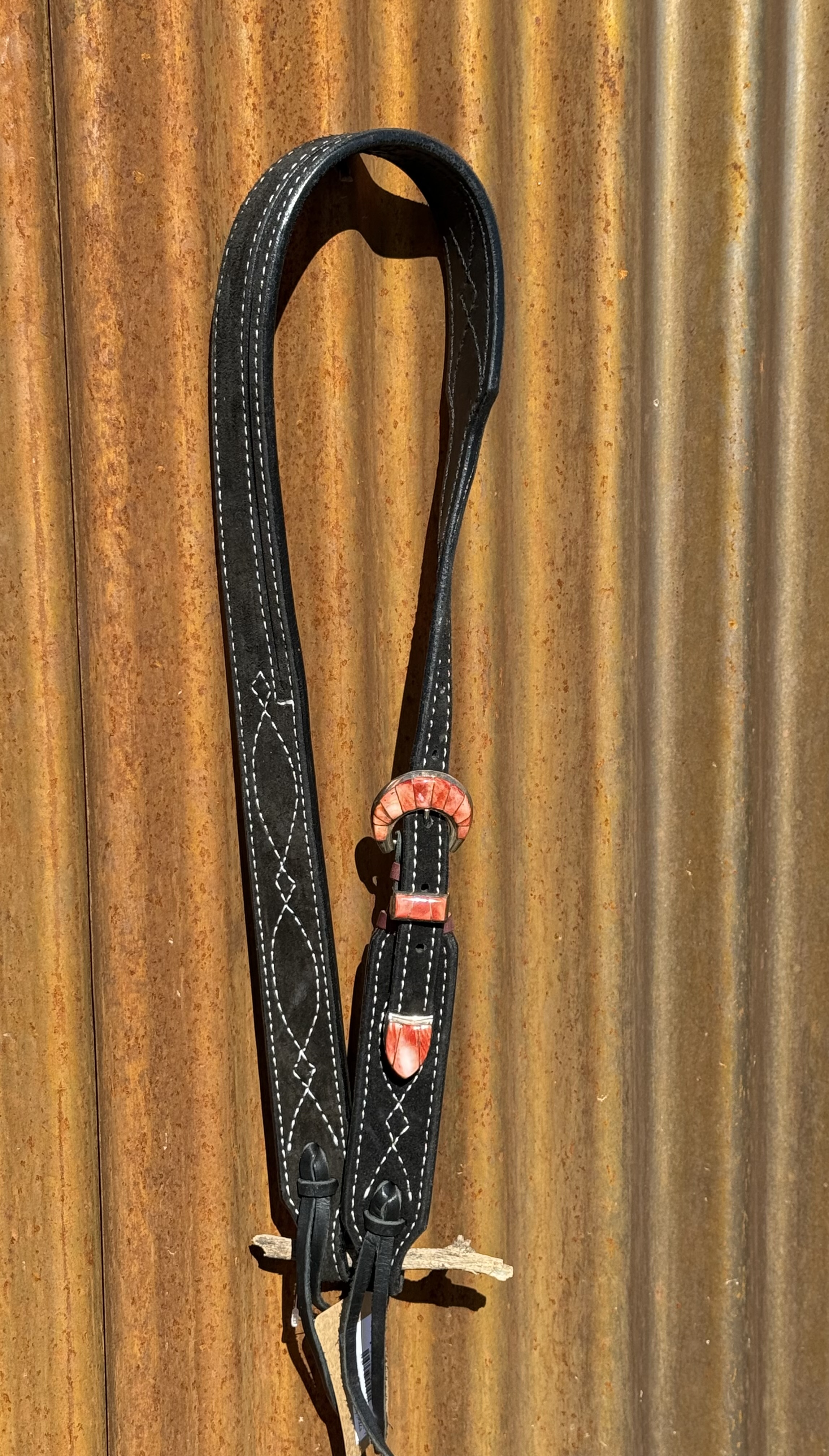 Premium Black suede leather Split ear Headstall lined in natural leather, stitched in white thread with a classic Gunslinger pattern!