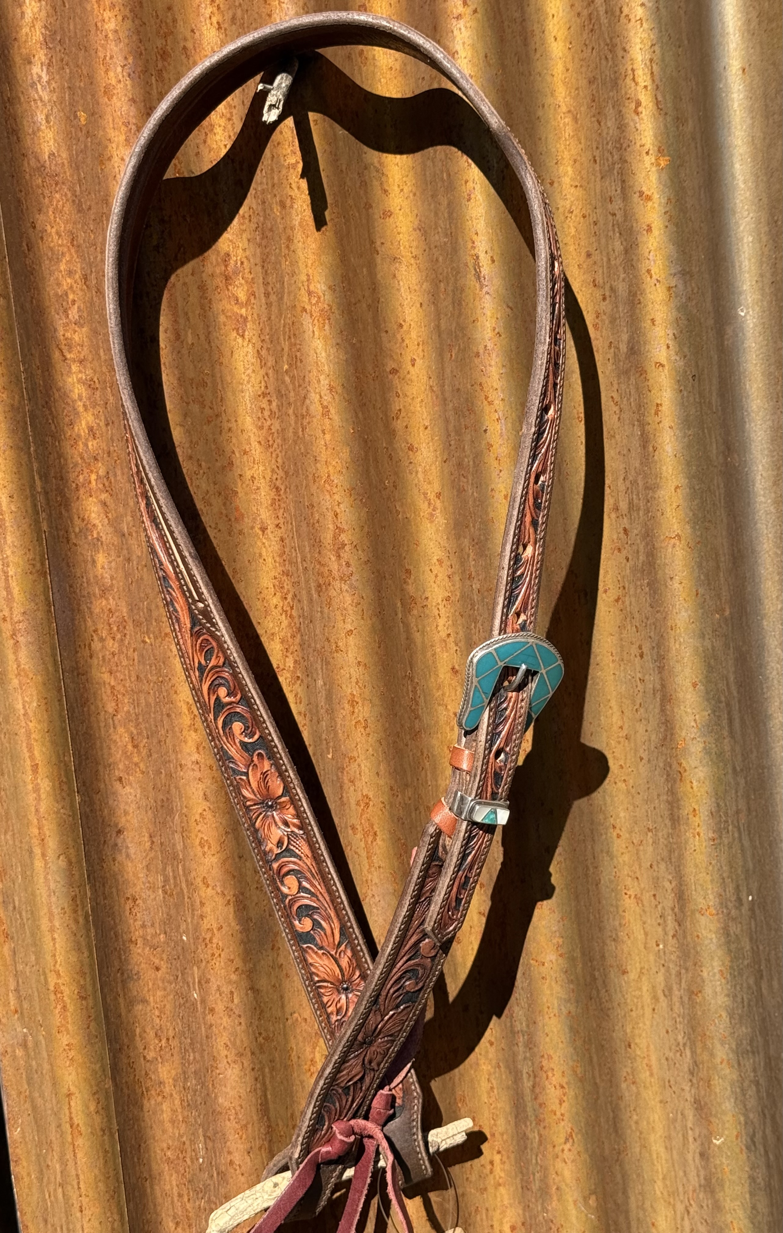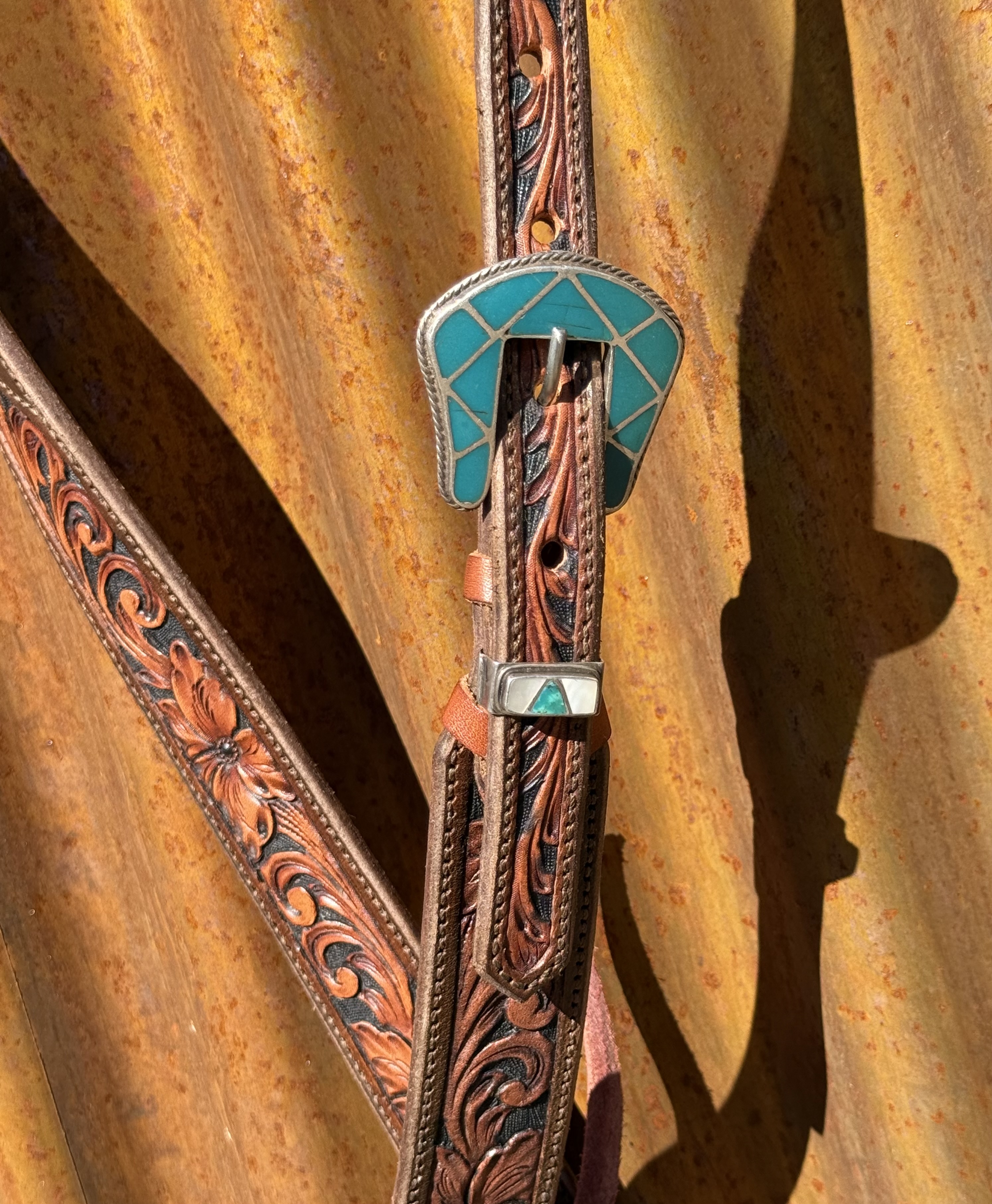 Floral Hand Carved Split Ear Headstall with Vintage Sterling Silver Buckle Set.