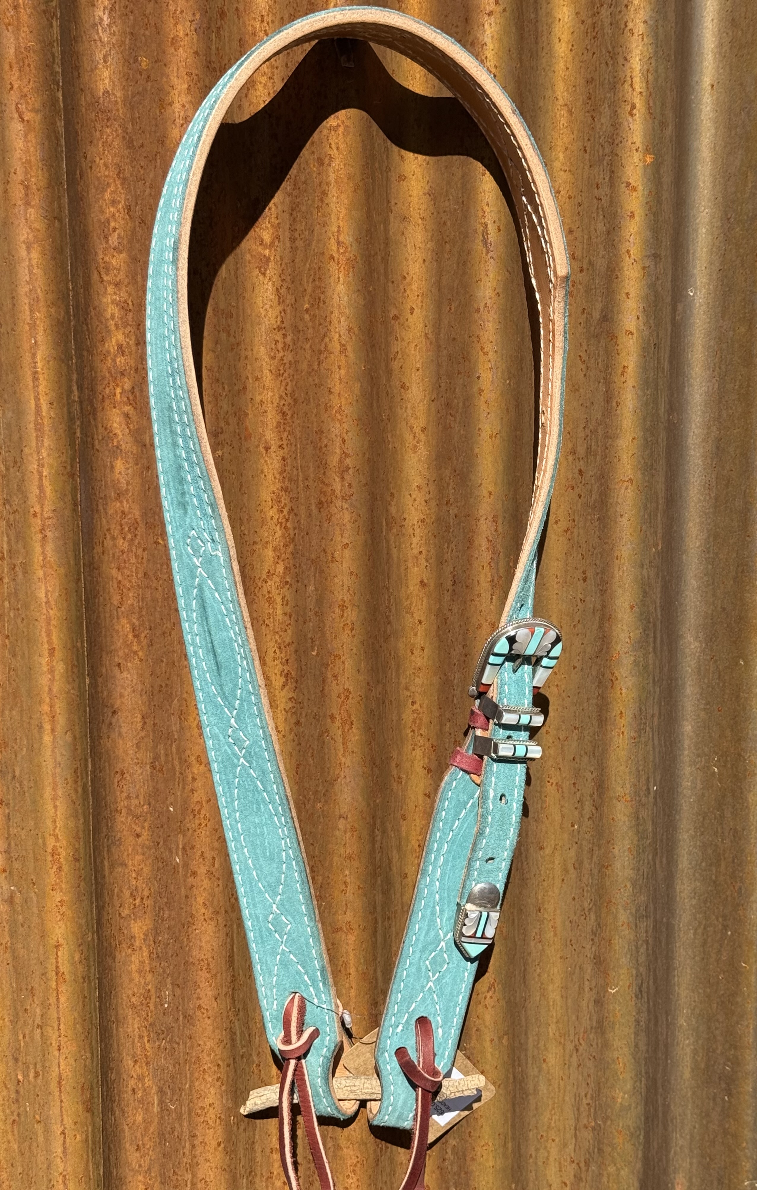Premium Turquoise suede leather Split ear Headstall lined in natural leather, stitched in white thread with a classic Gunslinger pattern!