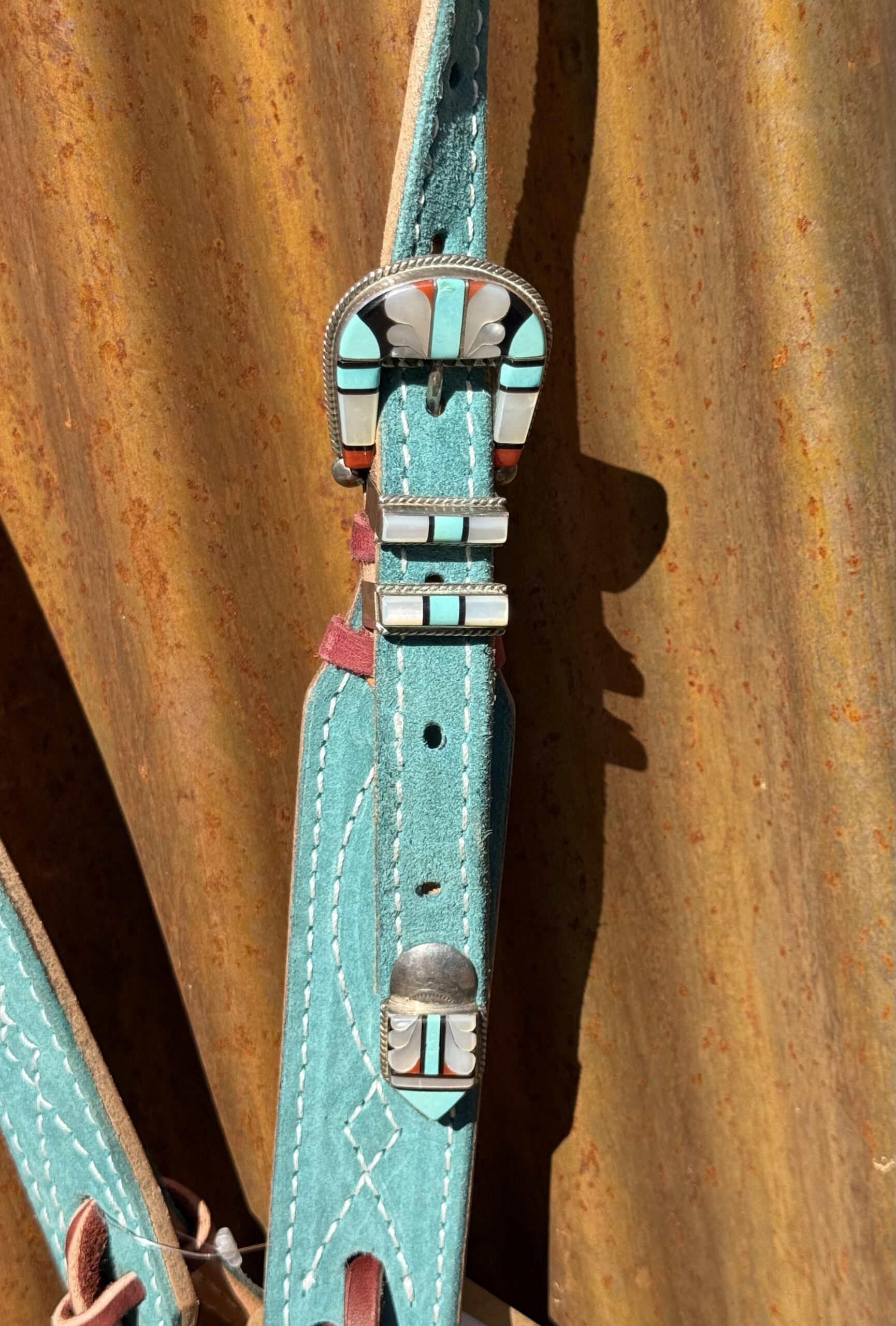 Turquoise Suede Leather Split Ear Headstall with Vintage Sterling Silver Buckle Set