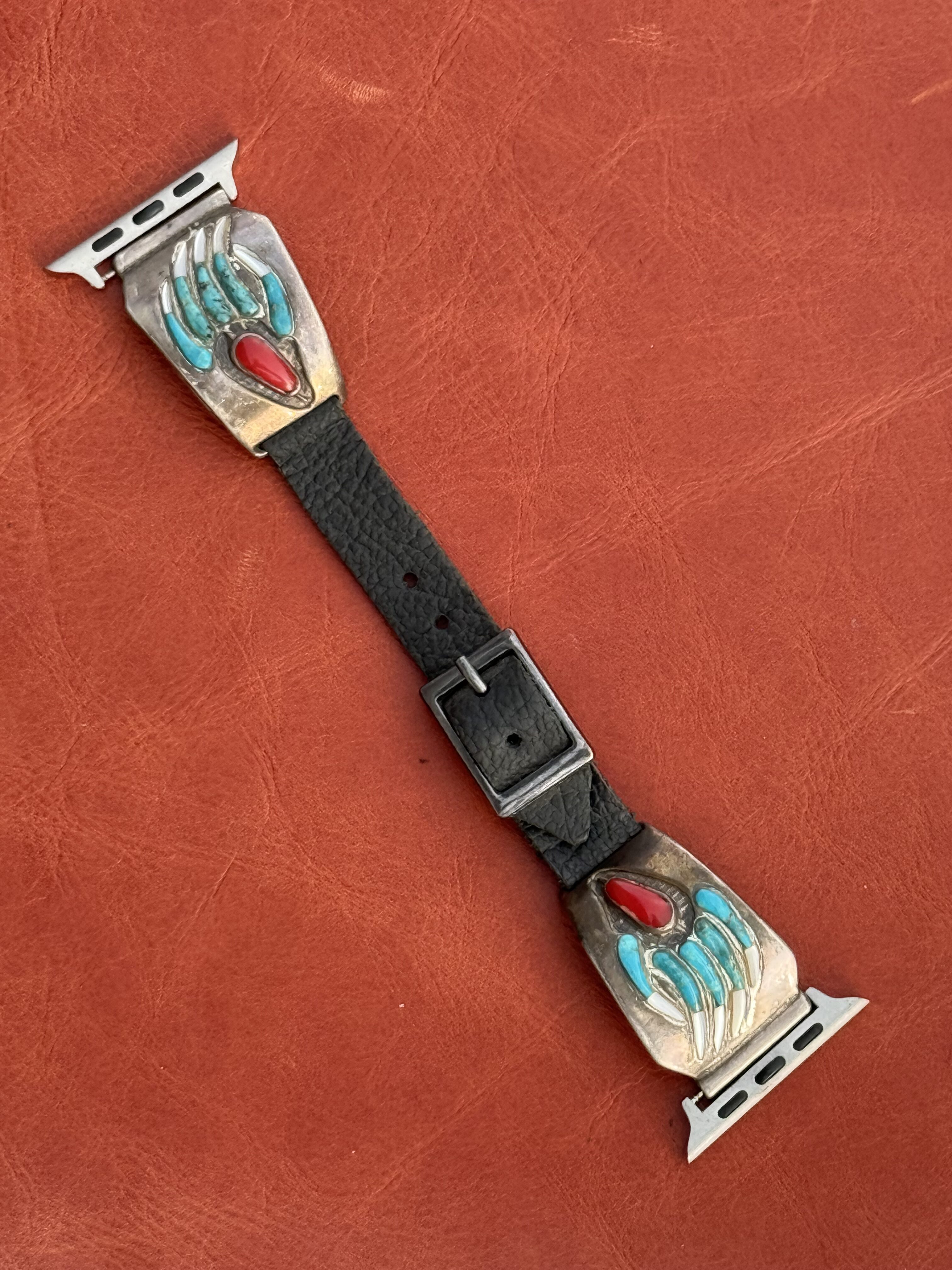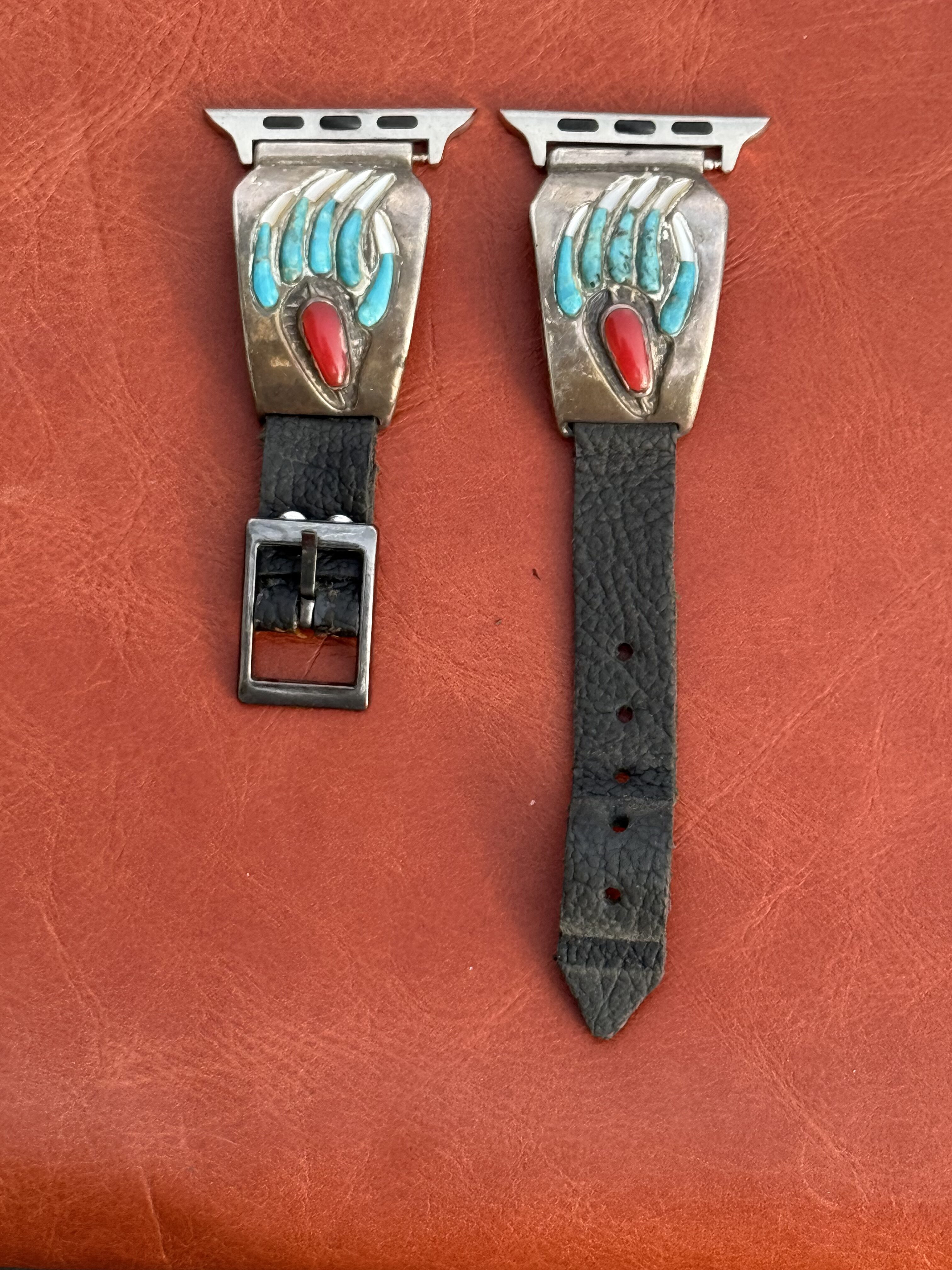 Vintage Sterling Silver Inlaid Bear Claw with Turquoise, Coral & Mother of Pearl Stones Watch Band