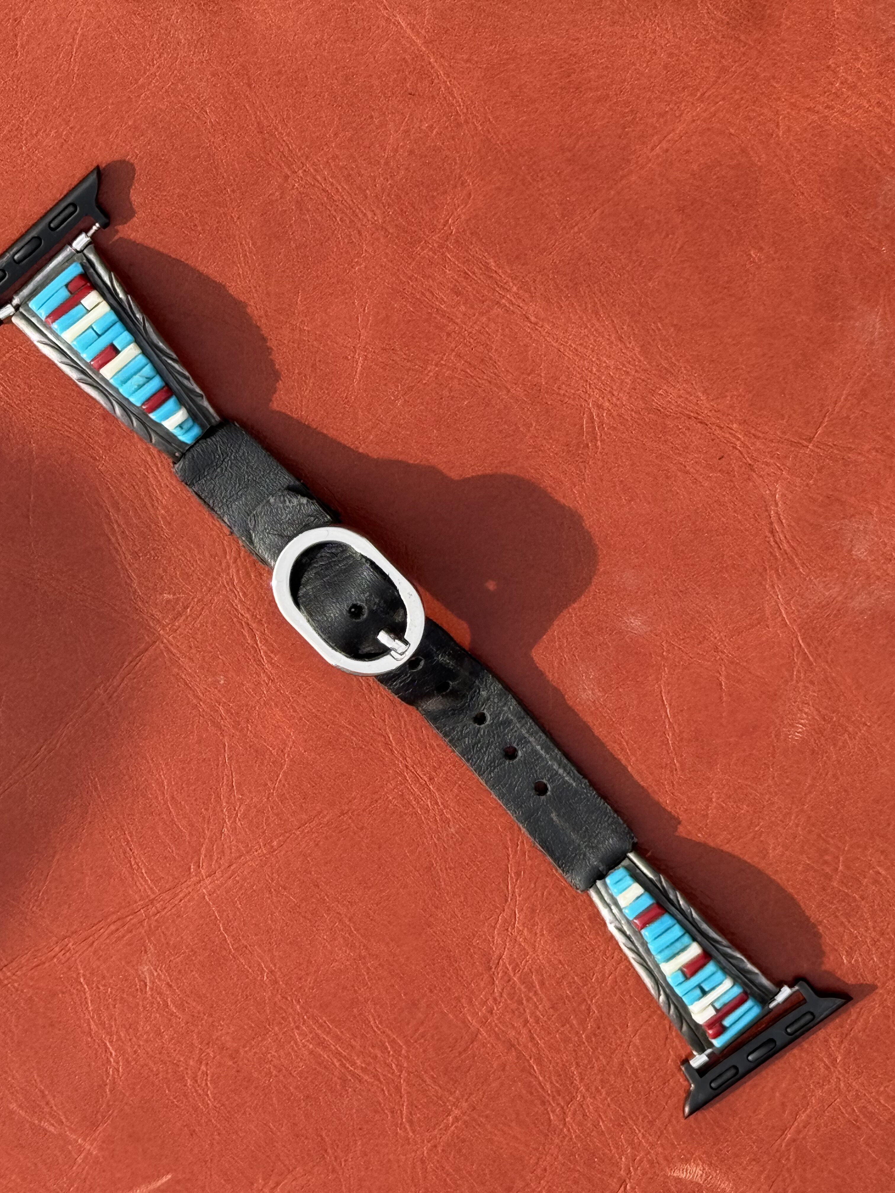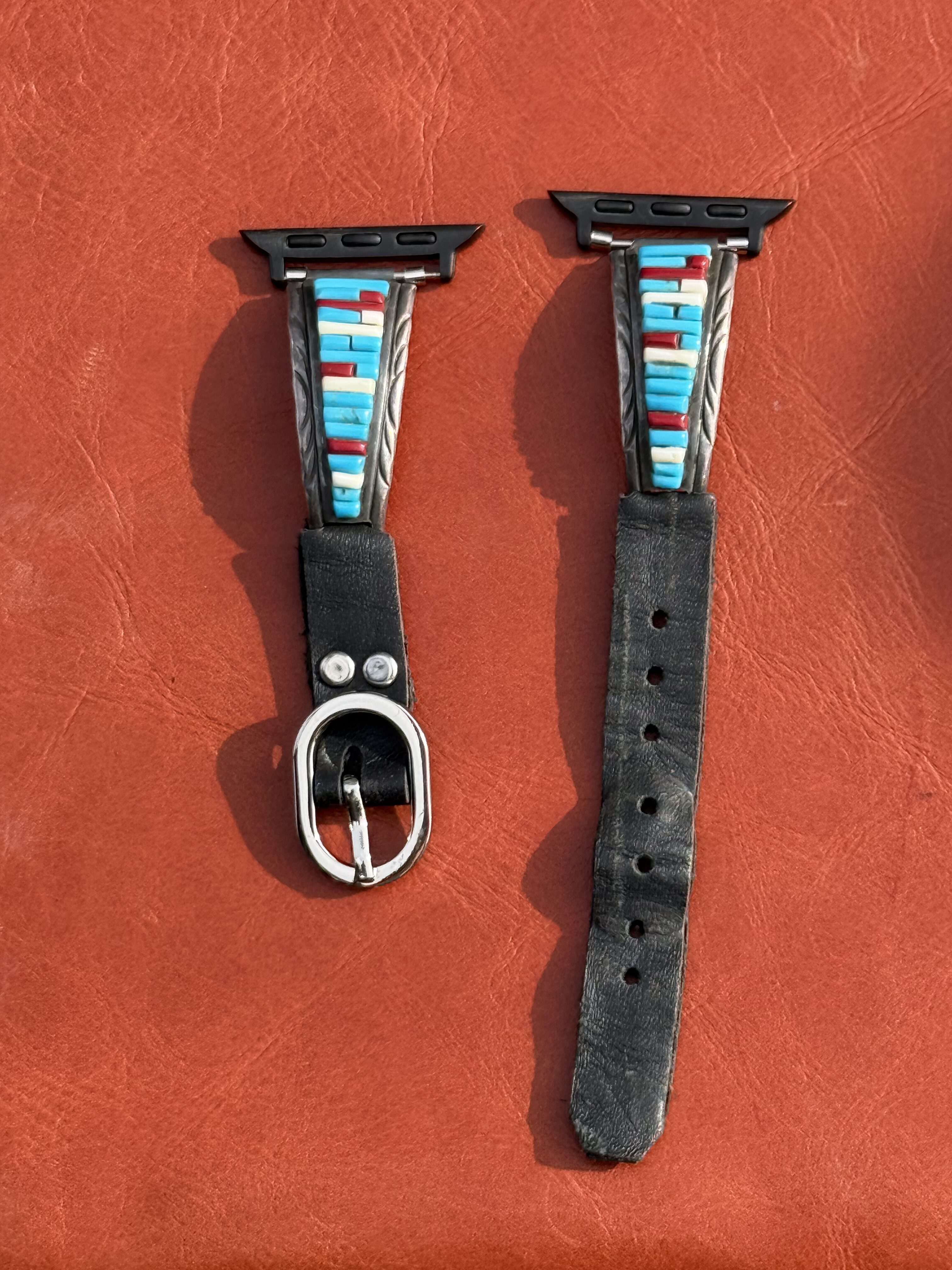Vintage Sterling Silver Inlaid with Turquoise, Coral & Mother of Pearl Watch Band