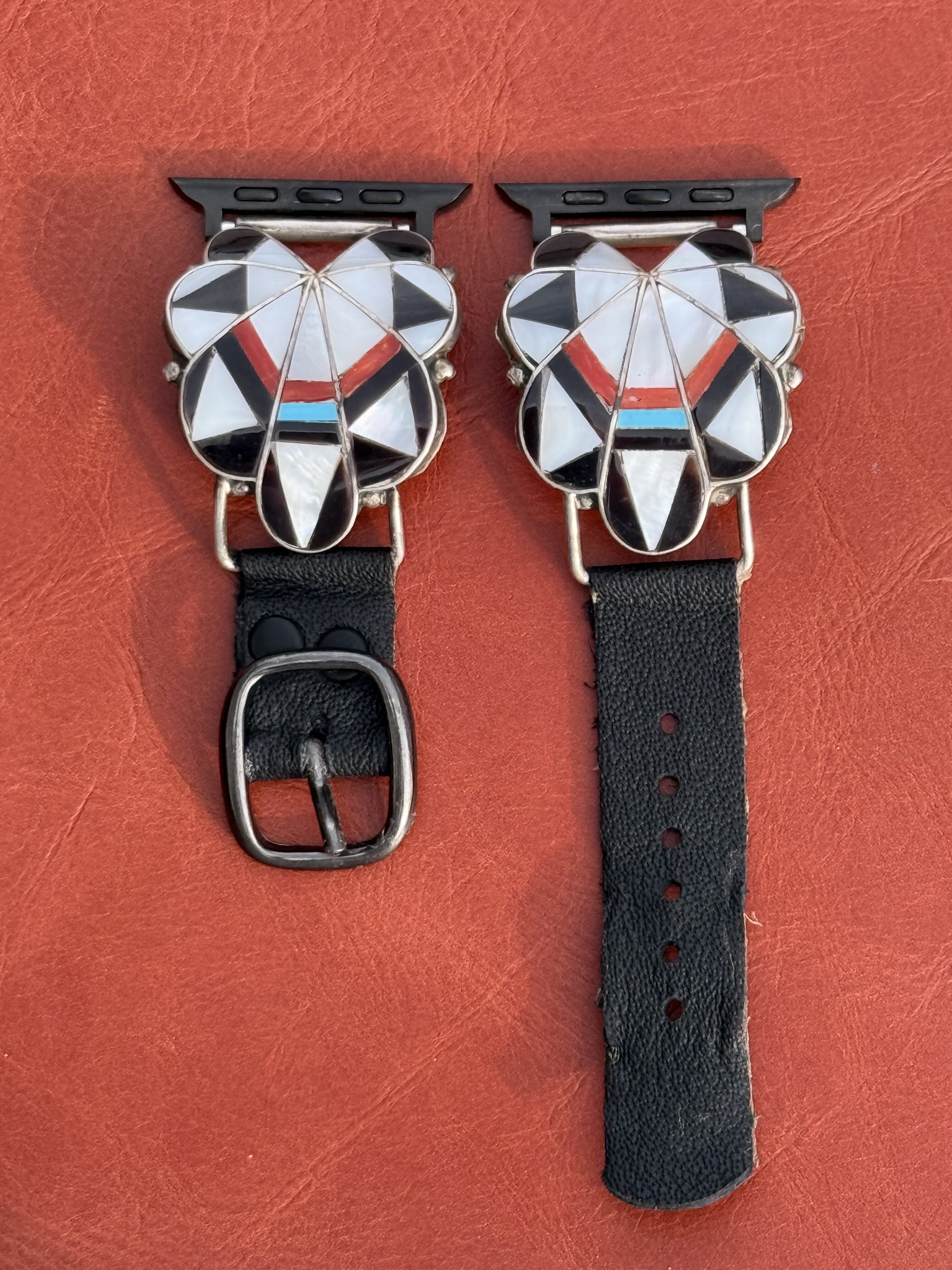 Vintage Sterling Silver Inlaid with Turquoise, Coral, Onyx & Mother of Pearl Stones Watch Band