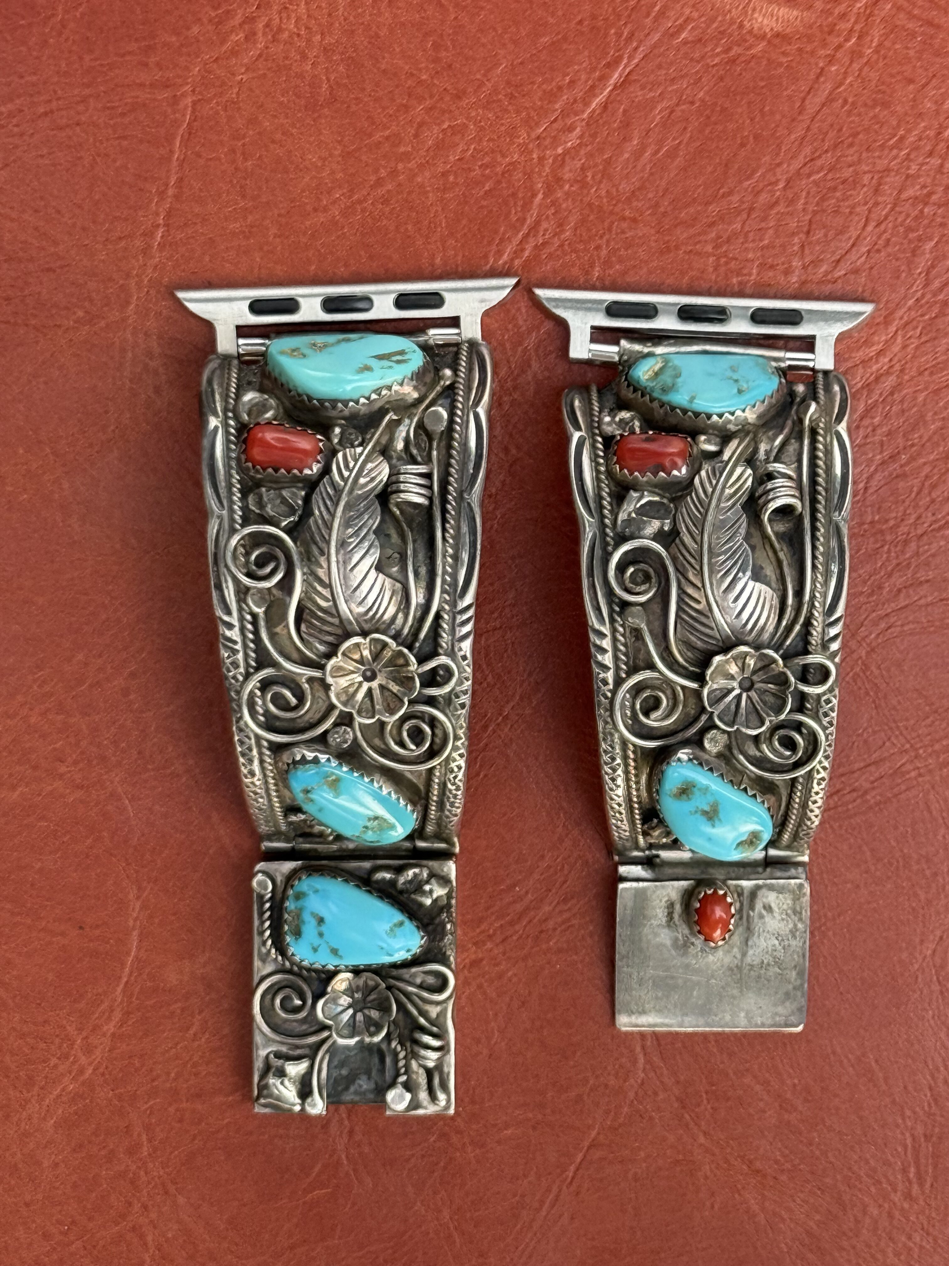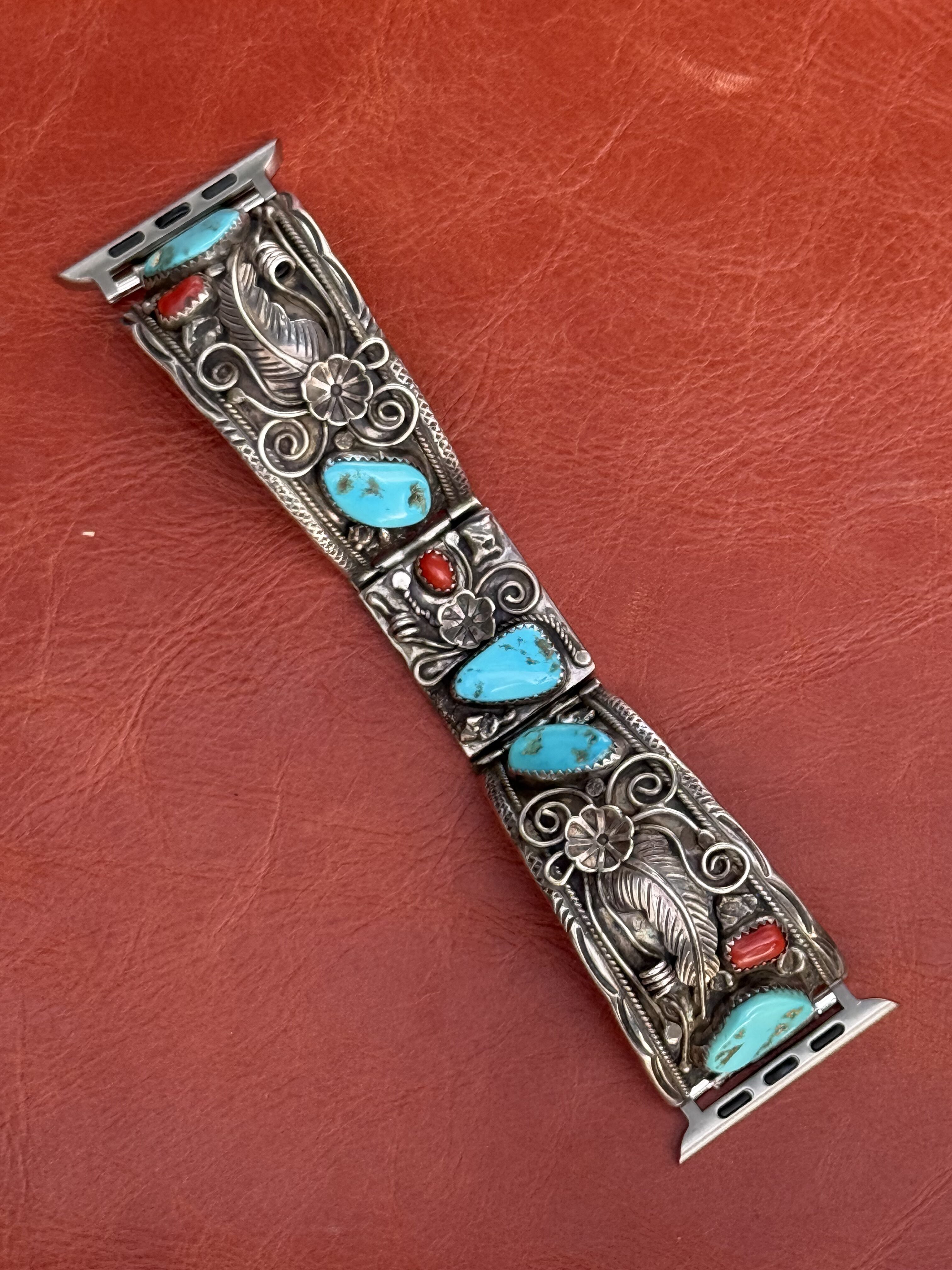 Vintage Sterling Silver with Turquoise Stones & Coral Watch Band